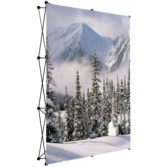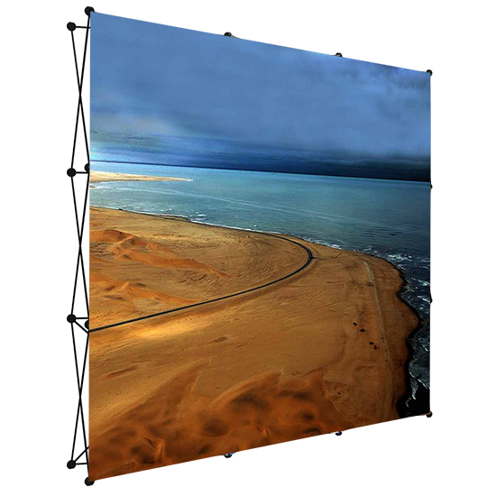 La Parete per Stand Fiera Genius Pop up ha un sistema di montaggio semplice e veloce: basta sollevare l'intera struttura ripiegata impugnando i nodi centrali, e immediatamente la parete si apre, con già il telo grafico incorporato.