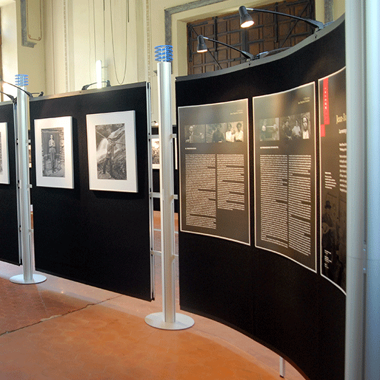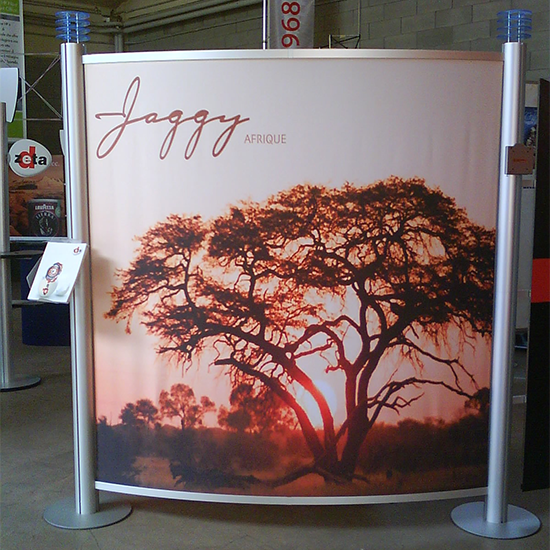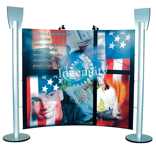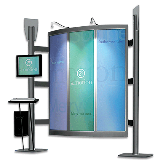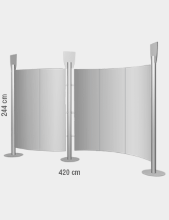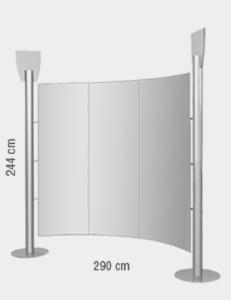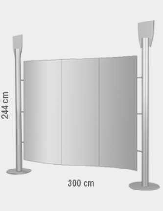 Parete curvilinea autoportante a 3 pannelli, sviluppo cm 300x244 h, composta da: due montanti in alluminio anodizzato con basamento circolare, set di tre pannelli frontali stampati e plastificati.